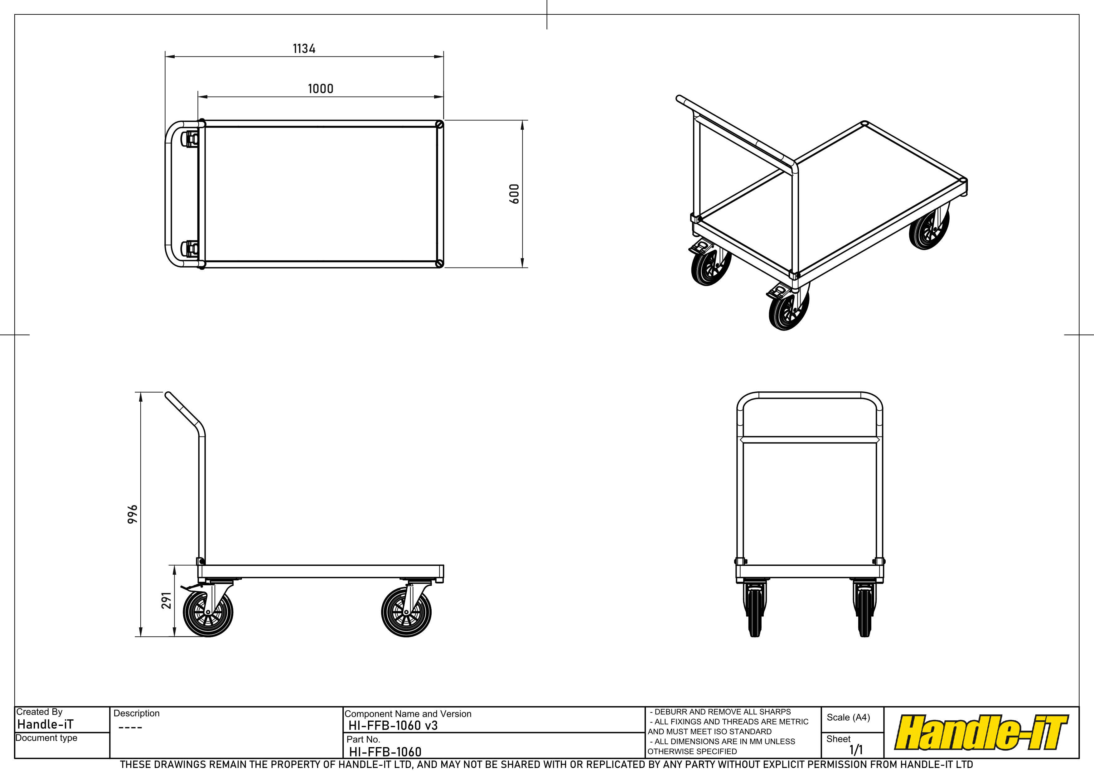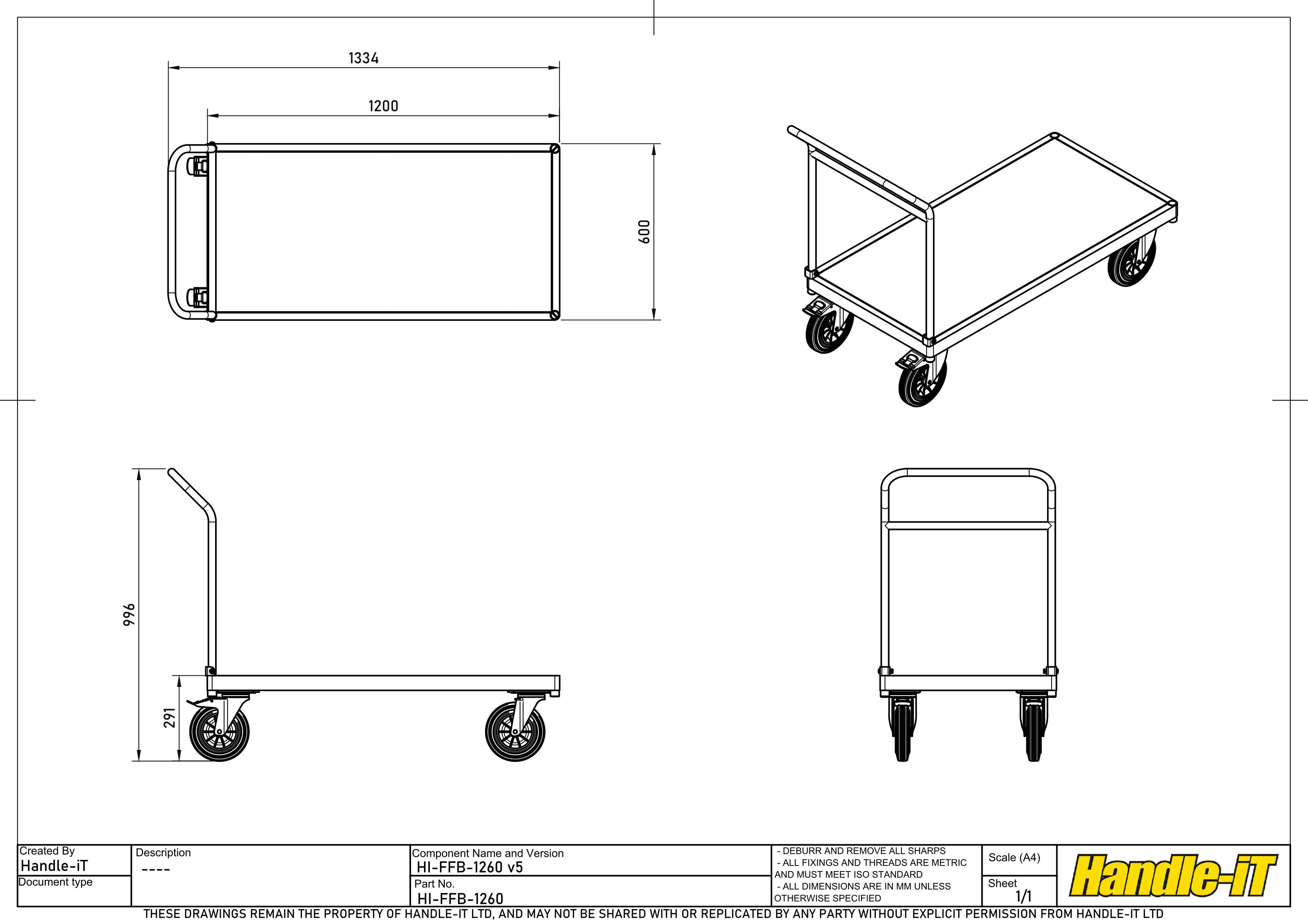 The range can be made to whatever size you require. With handles set at the perfect working height and angled away from the base to eliminate trip hazards with the statutory 120mm clearance. The laser cut base manufactured from a single piece of 50mm x 25mm box sections formed around the corner post location spigots, creates a beautifully rounded corner rather than a sharp and aggressive mitred corner that will make holes in walls and ankles in the unfortunate event of a collision. Mounted on high quality 200mm diameter wheels as standard, with 2 fixed castors for direction and 2 swivel with brake for manoeuvrability and safety, which will cope with any firm ground. Our Premium and Premium Plus Ranges of Platform Trucks all conform to BS-EN1757-1, giving you the confidence that Handle-iT is your safer choice.