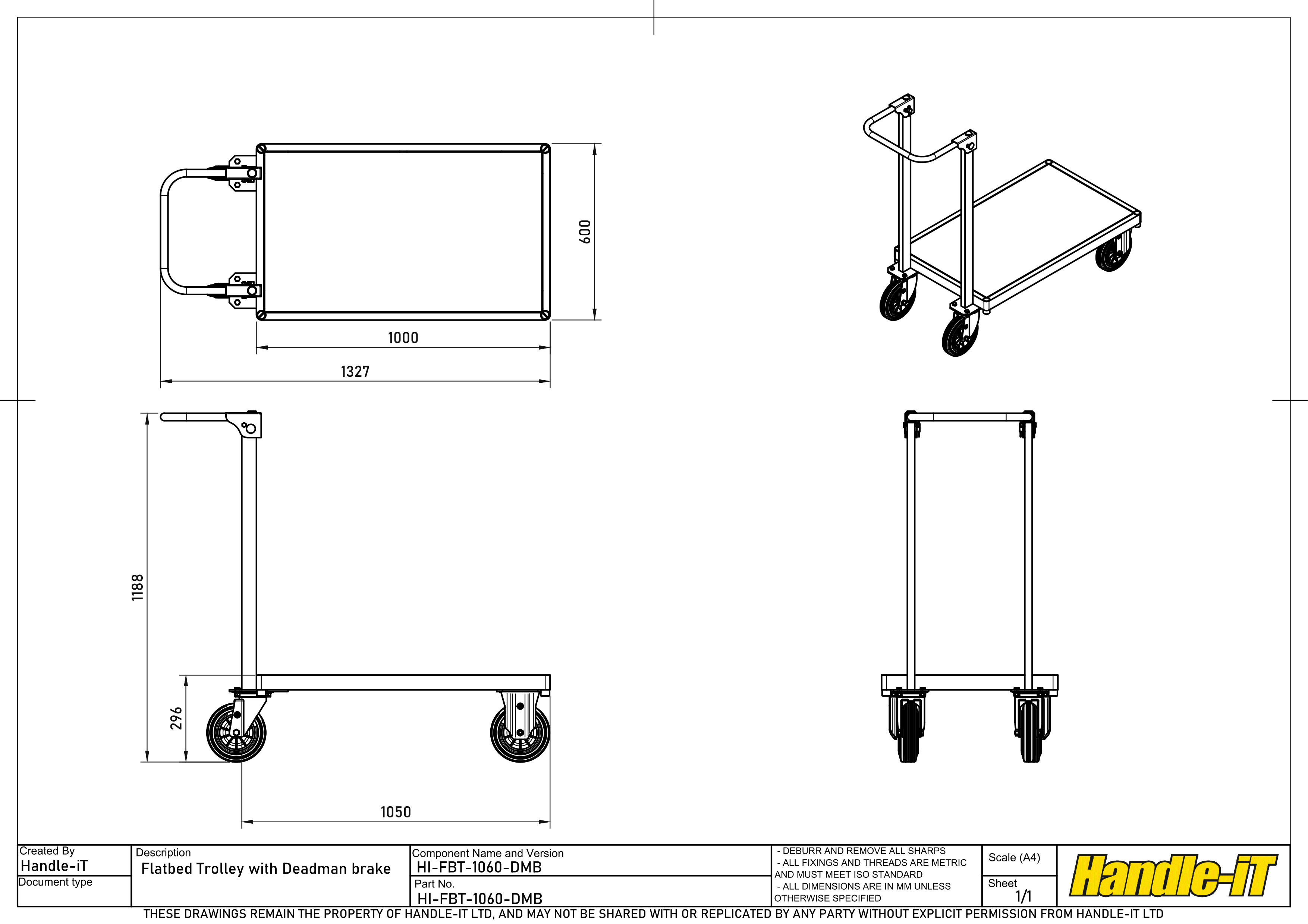 This Heavy-Duty Flatbed Trolley with Deadman Brake is based on our Premium Platform Trucks Range but features an easy-to-use Deadman braking system integrated in the handle. With the Deadman brake facility, the brake is positively always applied, until the operator makes the conscious decision to press down on the handle which will release the brake. So, in the unlikely event that the operator was to lose control, slip trip or fall, the operator will be your only concern as the trolley will automatically come to a stop, even on a slope, reducing risk to the public or colleagues. Built around our laser cut frames, which we create the base from one single piece of box section with just the one weld. This system produces beautifully rounded corners, which not only are safer around people than standard mitred corners but also provide the facility to add posts and sides to the trolley even as a retrospective fit. Mounted on our hard-wearing crumb rubber tyre, which even under braking still provide a long life. Manufactured in line with BS/EN1757-3 platform truck regulation, the Deadman braking builds another level of safety into arguably the safest range of platform trucks in the industry, making Handle-iT Your safer choice
