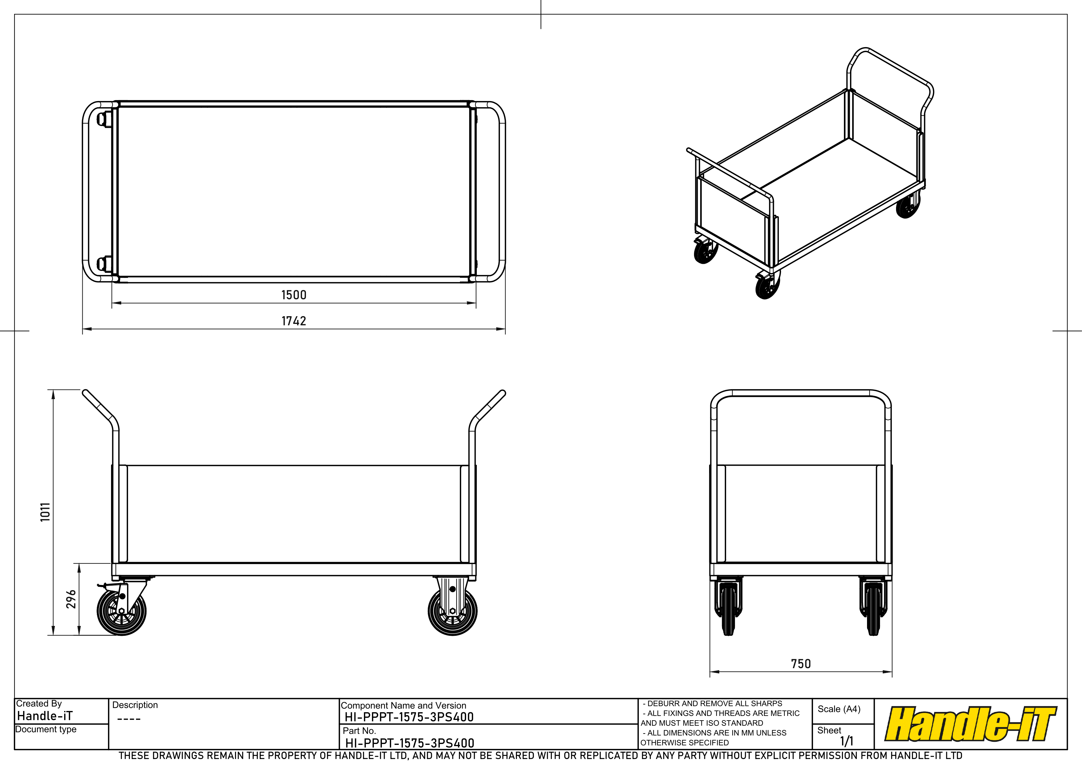 | HI-PPPT-1575-3PS400-4SWB-GNM | 1500mm x 750mm | 2x Swivel, 2x Braked Swivel | Grey Non-marking Tyre with Black Centre | In Stock | |