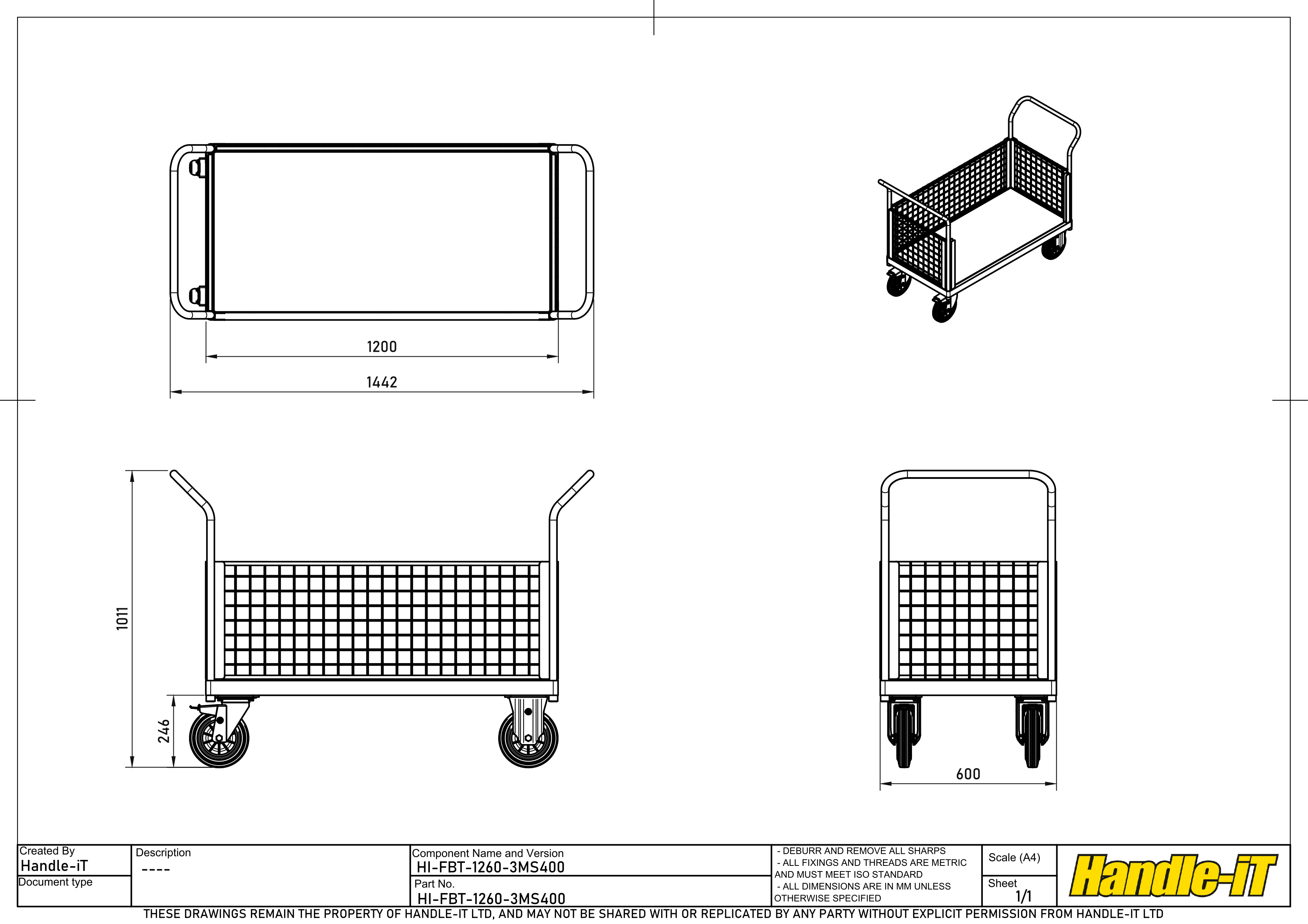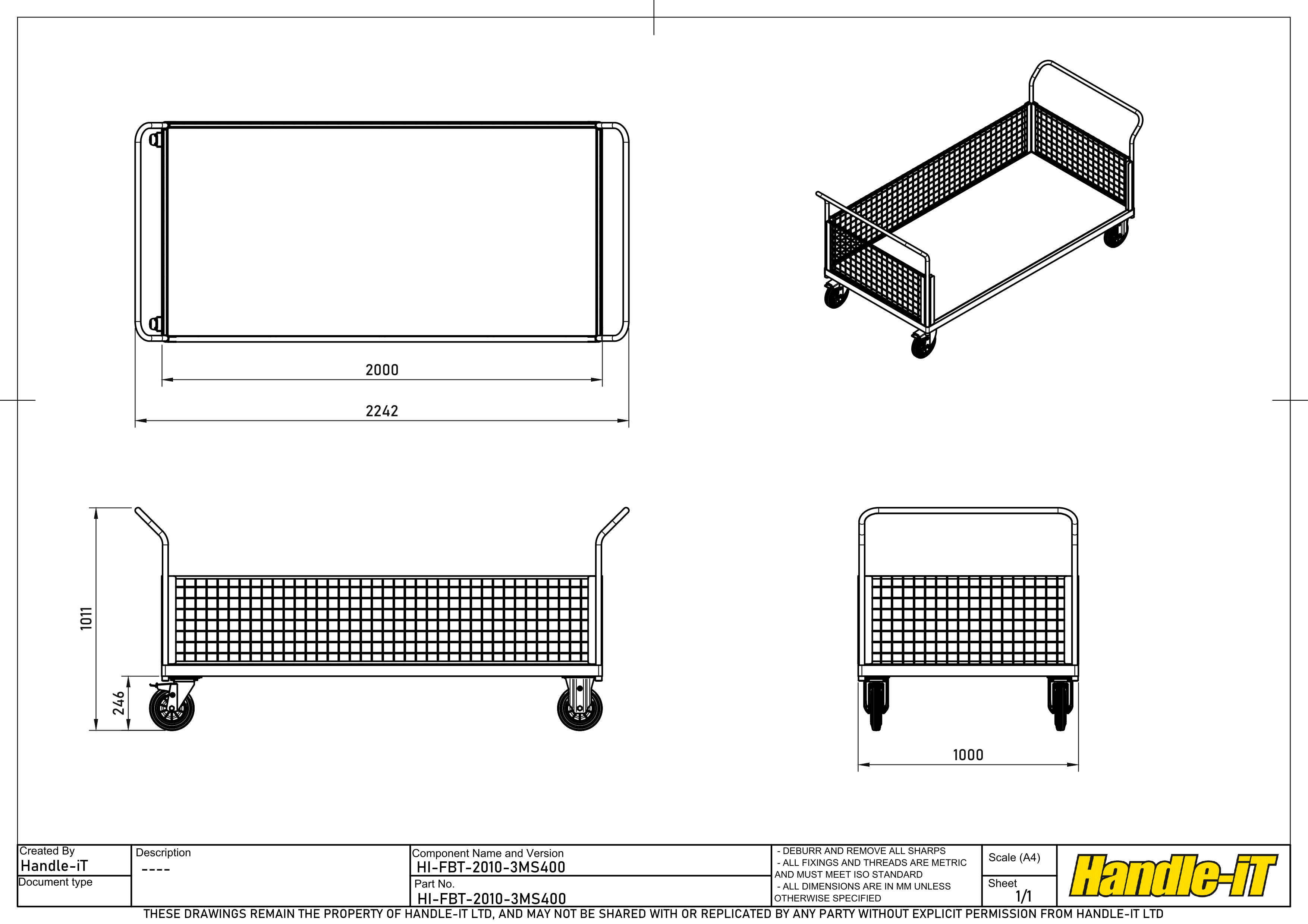 The Platform Truck with 3 Removable Mesh Sides is part of the Premium Platform Truck Range of mesh sided platform truck and trolleys and they are a modular design trolley that allow multiple configurations. Each trolley can carry one, two or three panels at any one time depending on the load you are carrying. The range can be made to whatever size you require. With handles set at the perfect working height and angled away from the base to eliminate trip hazard. With side panels that are removable in seconds without the need for any tools, nuts or bolts, just great engineering. The laser cut base manufactured from a single piece of 50mm x 25mm box sections formed around the corner post location spigots, creates a beautifully rounded corner rather than a sharp and aggressive mitred corner that will make holes in walls and ankles in the unfortunate event of a collision. Mounted on high quality 200mm diameter wheels as standard, with 2 fixed castors for direction and 2 swivel with brake for manoeuvrability and safety, which will cope with any firm ground. Finished with a hardwearing, scratch resistant, industrial epoxy powder coated finish.